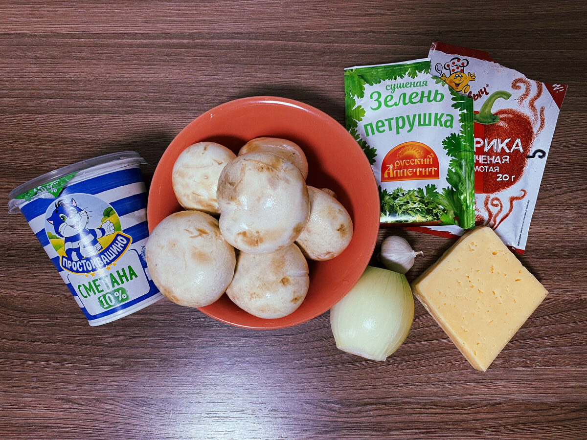 Всем привет! Советую вам приготовить эти вкуснейшие фаршированные грибы с сыром на сковородке ! Мало того что это вкусно , так ещё и быстро ! Это блюдо так же можно подавать как закуску 😋 P.S. Я готовила на ужин , на 2 персоны , если вы готовите к празднику , увеличьте ингредиенты в несколько раз. Для приготовления грибов мне понадобились такие продукты как : Теперь давайте разберёмся поэтапно. Этап 1. Начинка . Для начала возьмите 7 шт . шампиньонов и хорошо промойте , затем отделите шляпки от ножек , как на фото: Ножки нарезаем мелким кубиком и выкладываем в глубокую тарелку. Берем 1/2 луковицы нарезаем кубиком и отправляем к грибным ножкам . Берем 3 зубчика чеснока и мелко шинкуем и отправляем к грибным ножкам и луку , все хорошо перемешайте. В разогретую сковородку добавляем небольшой кусочек сливочного масла и обжариваем начинку до золотистого цвета. После того как пожарилась начинка , выкладываем ее в тарелку и добавляем 1,5 ст.л. сметаны , зелень, соль , специи по