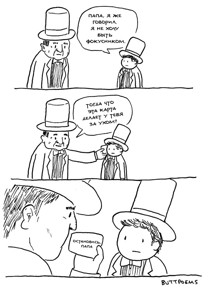 Хотите немного уличной магии? [Дэвид Блэйн]. А шуток про магов, настоящих и жуликов? Лично меня никогда особо не привлекали ни фокусы, ни более серьёзные представления иллюзионистов. Но вот истории и фильмы о их ремесле, нелёгком творческом пути и жизни в целом я нахожу весьма и весьма занятными. Вот и комиксы, да и вообще юмор на эту тему мне тоже пришлись по вкусу. Ведь любая тема связанная с волшебством и магией даёт огромный простор полёту фантазии. Начнём с классики жанра - карточных фокусов. Да и сам этот комикс такой старенький и известный, что уже наверно тоже может называться классикой. Автор ButtPoems Продолжаем в карточной теме и, как это делают в некоторых шоу иллюзионистов и фокусников, начнём раскрывать секреты трюка. Комикс от Anticscomic Есть достаточно простые карточные фокусы, которые вы и сами можете сделать без особой подготовки. Как раз одним из таких трюков делится с нами Mr.Lovenstein Гораздо сложнее удивить человека, который и сам что-то умеет и уже знаком с не