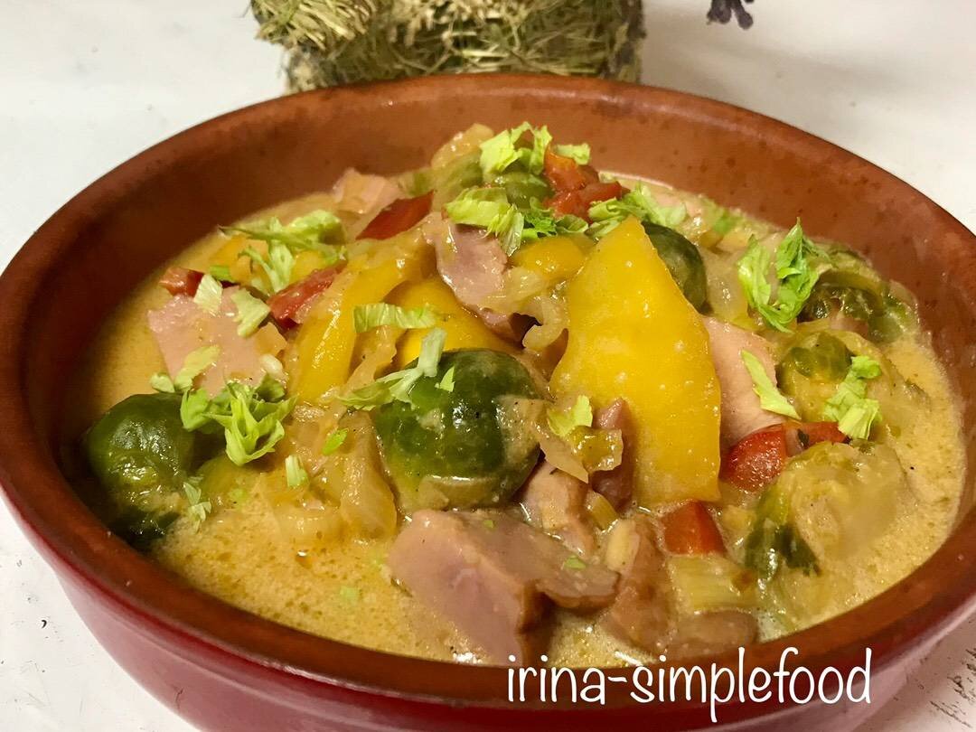 #академия #кухнимира Вкусное блюдо с экзотическим вкусом. Ингредиенты: брюссельской капусты свежей или свежезамороженной, сельдерея, репчатый лук, красный сладкий перец, чеснока, манго, сливочного масла, отварного мяса, Соль, Для соуса:, белого сухого вина, мясного бульона, жирных сливок, мускатного ореха, порошка карри, острого соуса Способ приготовления: Подготовить продукты, капусту нарезать на половинки, сельдерей нарезать тонкими ломтиками, лук, перец нарезать небольшими кубиками, чеснок измельчить, мясо нарезать кубиками, манго тонкими ломтиками. В глубокой сковороде разогреть 2/3 сливочного масла, обжарить лук, чеснок, сельдерей 5 минут, затем добавить перец и капусту, готовить 10 минут, помешивая. В небольшом сотейнике разогреть оставшееся масло и обжарить ломтики манго 5 минут. Отдельно приготовить соус, в сотейник влить вино, бульон, сливки, острый соус, приправить мускатным орехом, карри, посолить по вкусу, помешивая довести до кипения. В сковородку с овощами добавить мясо,