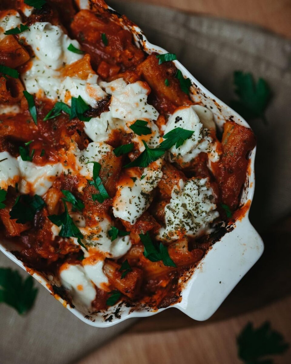 Ингредиенты Паста (по типу пенне) 1 банка томатной пасты или томатного соуса 1 банка вяленных томатов Специи: орегано, базилик, сухой чеснок, соль, перец 1 буррата Зелень для подачи (петрушка/базилик) Приготовление Пасту в глубоком противне перемешайте вместе с томатной пастой, нарезанными вяленными томатами и специями. Добавьте пару столовых ложек масла, оставшегося в банке с томатами и все тщательно перемешайте. Соуса должно быть в два раза больше, чтобы полностью покрывать пасту. Готовую смесь поставьте в духовку на 30-40 минут при 180 градусах. После этого достаньте и сверху положите кусочки бурраты, верните в духовку до полного расплавления сыра. При подаче украсьте зеленью.