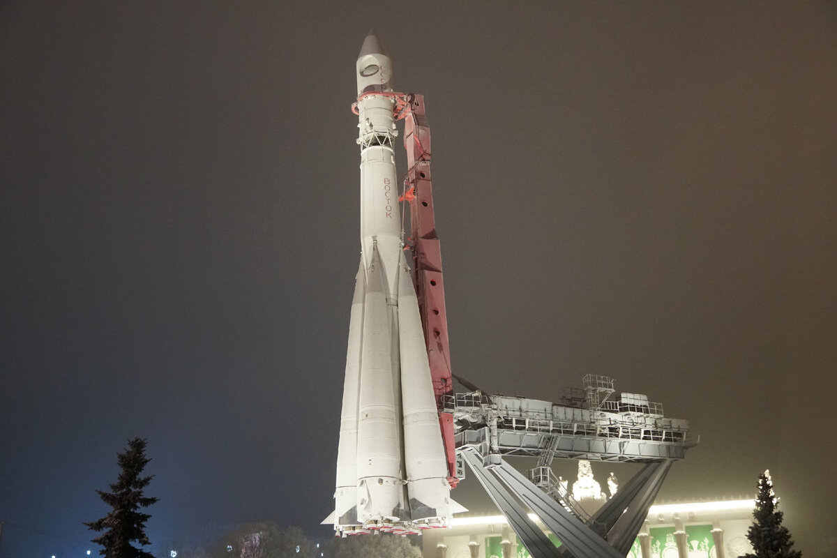 Макет ракеты-носителя «Восток» был установлен на ВДНХ 8 июля 1967 года — в честь 50-летия со дня Великой Октябрьской социалистической революции. Ракета-носитель «Восток» занимает особое место в истории отечественной космической программы, ведь именно этот аппарат 12 апреля 1961 года вывел на околоземную орбиту «Восток-1», на котором Юрий Гагарин совершил первый в истории Земли пилотируемый полет в космическое пространство. Макет ракеты «Восток», изготовленный в Самарском ракетно-космическом центре (ныне — РКЦ «Прогресс») весит 25 тонн. Готовый к старту оригинал — 287 тонн. Общая длина ракеты-носителя «Восток» — 38,4 метров (это высота 16-этажного дома). Максимальный поперечный размер — 10,3 метра. Максимальная масса полезного груза ракеты-носителя «Восток» при выводе на орбиту — 4730 кг. Для установки было подобрано место на площади Промышленности, где в 1954 году был обустроен большой круглый фонтан-чаша (фактически, декоративный пруд), а до этого, в 1938-1951 годах, стоял г