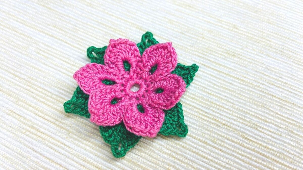Вязаный крючком цветок с зелеными листиками. Мастер-класс с пошаговыми фотографиями.