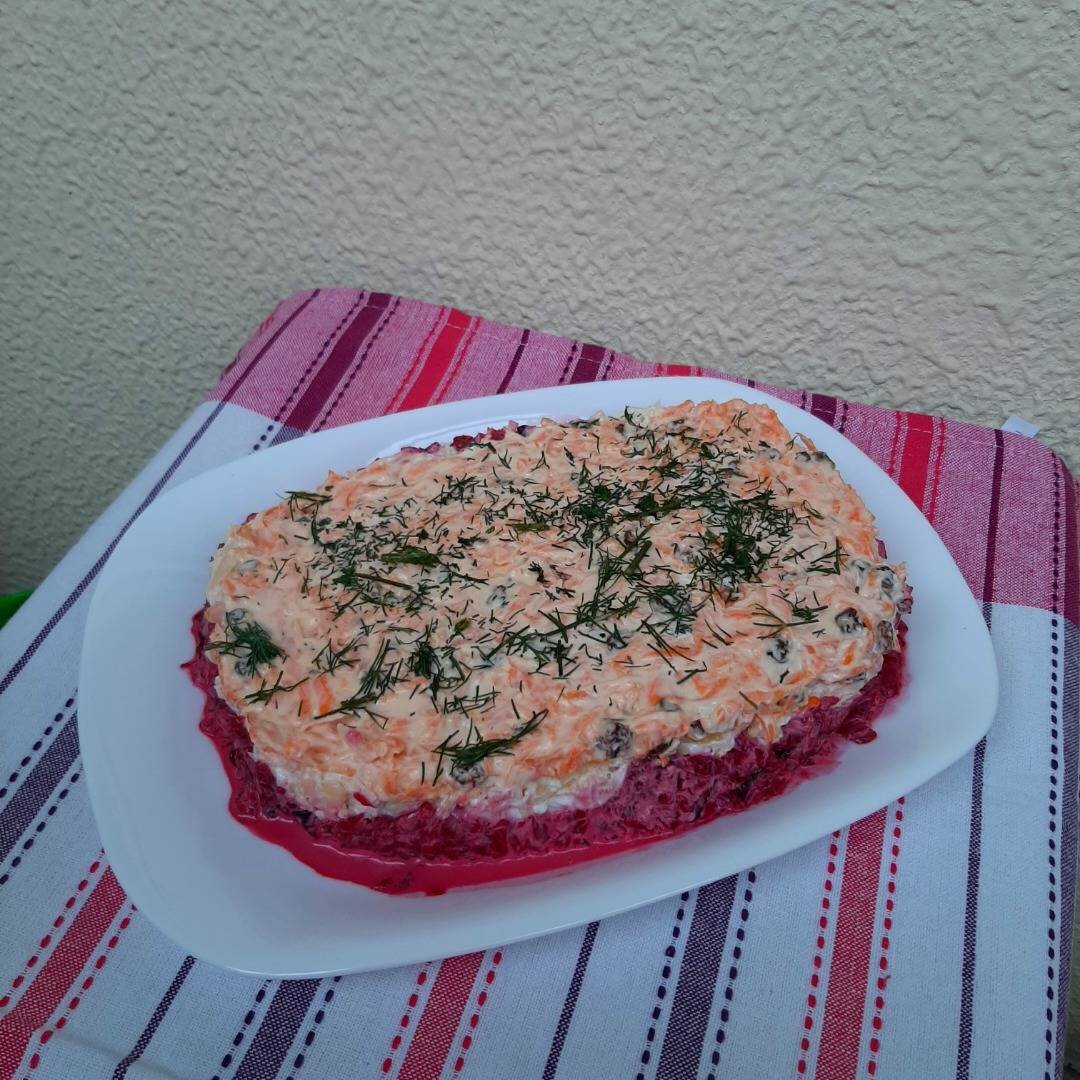 Очень вкусный салатик из моркови, свеклы, чернослива. Салат по этому рецепту не требует времени для пропитки. #идея #обед #ужин #академия #салат Ингредиенты: средняя сваренная свекла, средняя морковь, чернослива, твердого сыра, изюма, чеснока, майонеза Способ приготовления: Чернослив замочить и оставить на 10 минут. Мелко порезать. Изюм замочить и оставить на 10 минут. Чеснок почистить и мелко порезать. Сыр натереть на крупной терке. Свеклу натереть на крупной терке. Морковь почистить и натереть на крупной терке. Салат выкладываем слоями: 1 слой - свеклу перемешиваем с измельченным черносливом и майонезом. 2 слой - натертый сыр смешать с с чесноком и майонезом. 3 слой - натертую морковь смешать с изюмом и майонезом. Салат готов. Приятного аппетита!!!