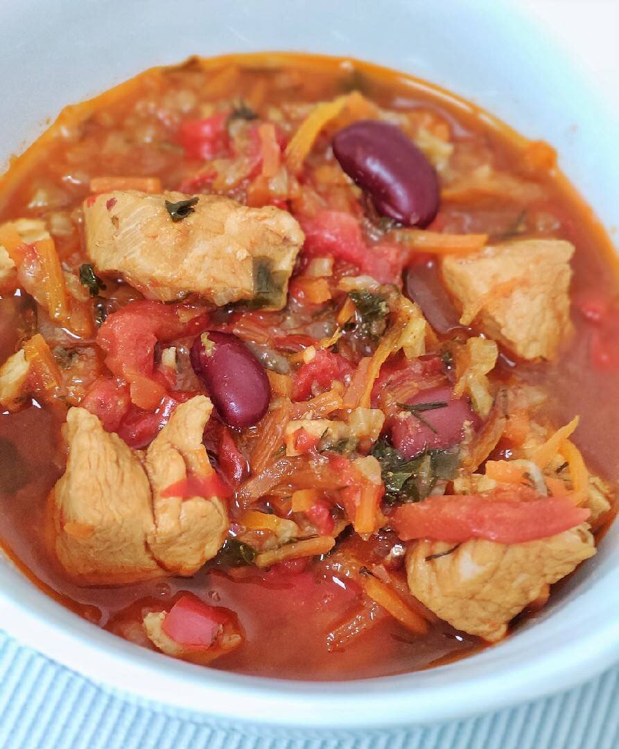~92 ккал 🍗🧅🍅🥕🫑🫘 Ингредиенты: мясо птицы (у меня куриная грудка), лук репчатый, томаты в собственном соку, морковь, перец болгарский, фасоль в собственном соку, зелень (лук, укроп, петрушка), соевый соус, оливковое масло, приправа для курицы, смесь красных перцев (острый + паприка) Способ приготовления: Мясо порезать кубиком, овощи соломкой, с фасоли слить жидкость, томаты очистить от кожицы, если были неочищенные. Порубить зелень, приготовить специи. В глубокой антипригарной ёмкости обжарить лук до мягкости и карамелизации. Добавить мясо, соевый соус и специи. Перемешать. Засыпать морковь, сверху болгарский перец, накрыть крышкой и потомить на медленном огне минут 10. Перемешать и готовить ещё минут 20 периодически помешивая. Добавить томаты и фасоль. Готовить всё вместе ещё 15 минут. Засыпать зелень, перемешать, потомить ещё минут 5-7. Выключить огонь, оставить на плите «доходить».