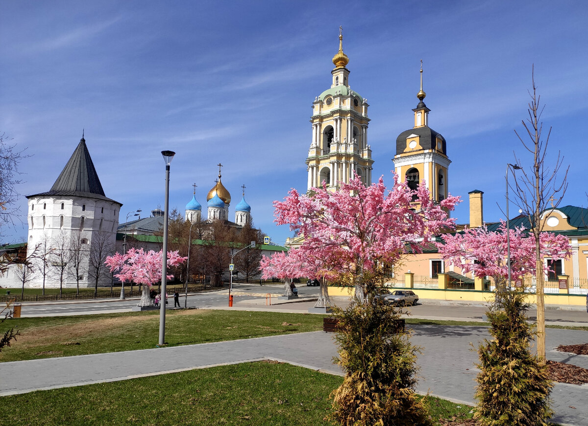 Вчера была в районе метро Пролетарская и глаз зацепился за цветущие деревья, издали очень напоминающие сакуры. Конечно же, любопытство заставило подойти поближе и посмотреть, в чем дело. Ведь в Москве фруктовые деревья еще не проснулись и цвести будут ближе к середине мая. Оказалось, что цветущие сакуры искусственные, но очень реалистично выполненные, а в вечернее время на них еще и иллюминация зажигается. Такой подарок сделал москвичам в преддверии главного христианского праздника Светлой Пасхи Новоспасский ставропигиальный мужской монастырь, расположенный на Крутицком холме рядом с Москва-рекой. Монастырь основан в конце XV века и ныне он действующий. Кроме оригинальных розовых деревьев площадь перед монастырем украшена огромными пасхальными яйцами, которые вечером тоже светятся. А еще там есть пасхальные венки. Я не знаю, как их правильно назвать. Если не так, то поправьте, пожалуйста. На монастырской территории около крепостной стены разместилась небольшая пасхальная ярмарка. Т