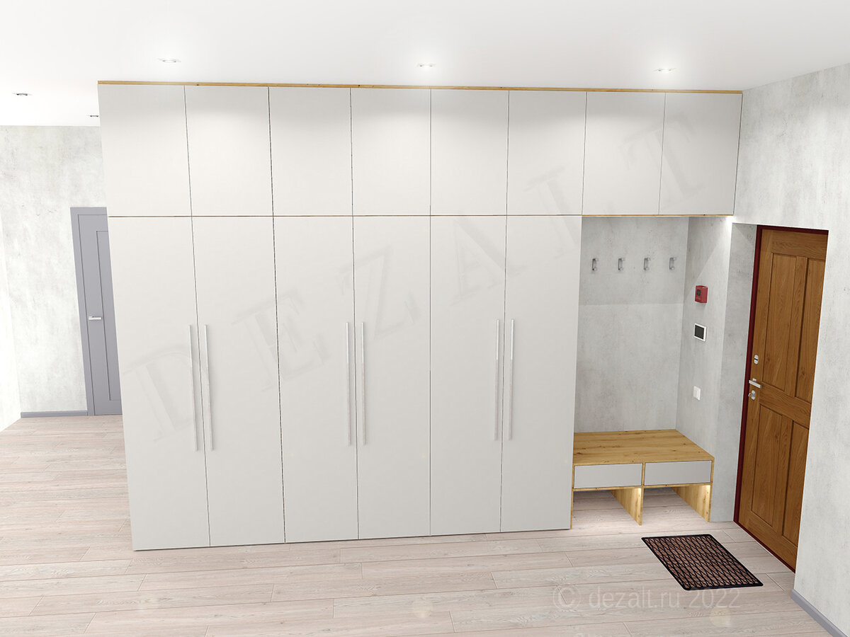Вот какой получился шкаф из прямой трансляции, я его рисовал в прямом эфире. Руки дошли, сделал сегодня рендеры, добавил блики на лампочки, добавил немного резкости. Работы вышла внешне не интересная. Ну во-первых я не дизайнер. Во-вторых у клиента стены серые, светло-бежевый пол, российский стандарт скучный. Но если даже и было бы что-то яркое, честно сказать я бы лично ничего интересного не смог предложить. Это я так, брюзжу... Шкаф получился дорогим, тут 6 листов полностью уходит и одного куска не хватает, но это при условии что все будет одного цвета. Если делать как у меня на картинках цветных, корпус древесный, двери однотонные, возможно что понадобится 7 листов полных. Ну это мелочи. Сейчас к стати с материалами все нормализовалось, я про Эггер. Как не позвоним к дилерам, все есть. Буквально в январе приходилось еще людям голову морочить, чтобы они выбирали по 3-5 цветов по важности, а мы закажем тот, который есть. Либо ждать неопределенное время. Сейчас пока все на складах е