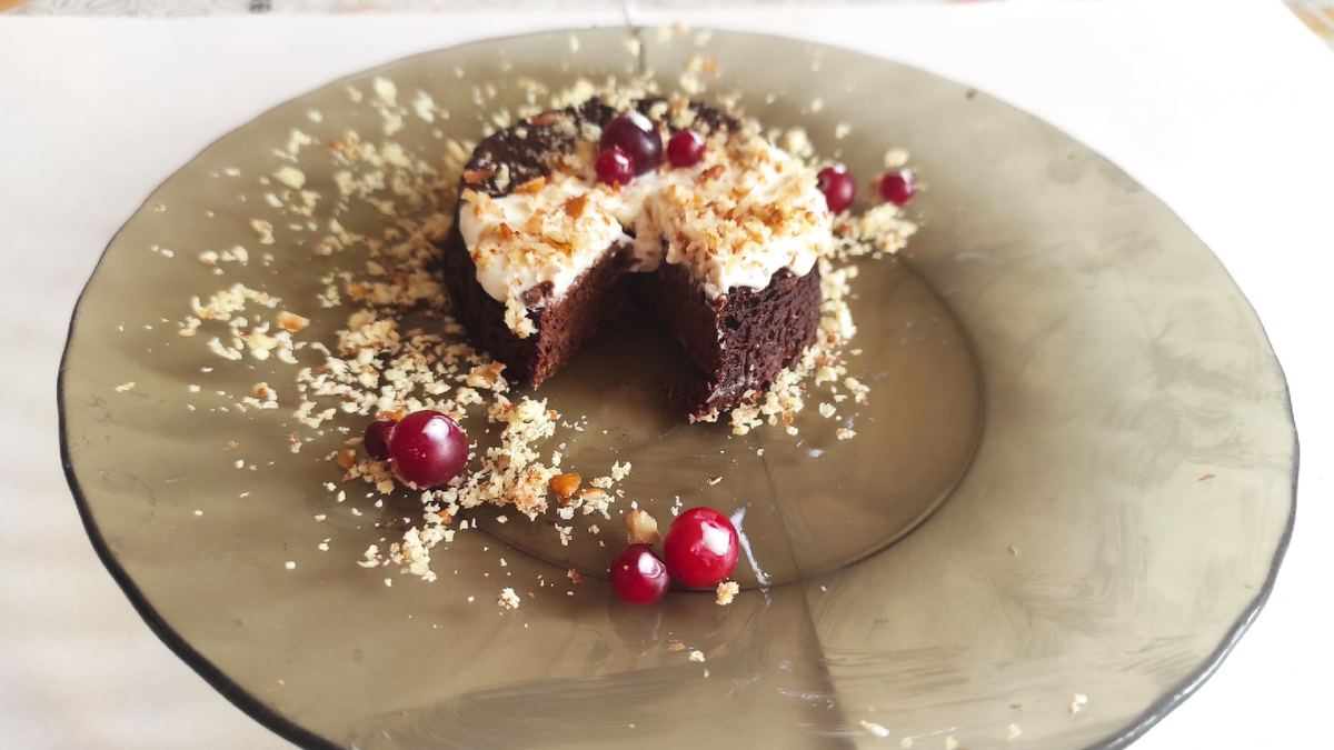 На выходе получается вот такой десерт пп. Можно украсить ягодками по желанию, по вкусу. В моём случае я полила греческим йогуртом и посыпала немного грецким орехом(тертым). У меня получилось вот такое блюдо. Выглядит достаточно аппетитно