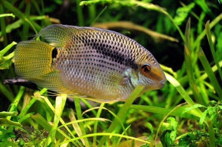 Цихлазома мезонаута (Mesonauta festivus) АРЕАЛ ОБИТАНИЯ: Широко распространены на значительной части Южной Америки. Встречаются в водоёмах и речных системах Бразилии, Парагвая, Перу и Боливии. Предпочитают регионы с чистой водой, медленным течением и богатой водной растительностью. ОПИСАНИЕ: Взрослые особи достигают в длину до 20 см. Половой диморфизм выражен слабо. Рыбка имеет угловатую форму тела сильно сжатую с боков. Анальный и спинной плавники заострены. Характерной особенностью вида служит чёрная полоса, проходящая диагонально от глаз до задней части спинного плавника. Окраска варьируется от серебристой до жёлто-коричневой. Расцветка зависит от региона происхождения конкретного подвида. Прыгучая рыбка, обладающая миролюбивым нравом. СОДЕРЖАНИЕ: Для содержания цихлазомы мезонаута подойдет закрытый аквариум. Оптимальные размеры аквариума для одной пары рыбок начинаются от 100–120 литров. Допустимо совместное содержание с теплолюбивыми видами аквариумных рыб, к