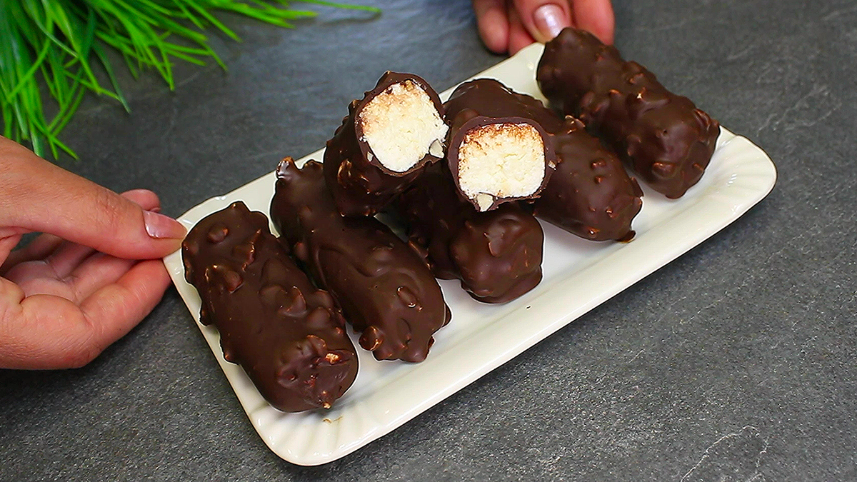 Сегодня готовлю вкуснейший десерт на основе творога, который мои дети не просто любят, а обожают и готовы есть его хоть каждый день: )) Готовится он очень просто, из простых доступных продуктов, а получается невероятно вкусно и уж точно полезнее и вкуснее, чем покупные сырки из магазина. Попробуйте, уверена, вам тоже понравится! Необходимые ингредиенты и видеорецепт вы можете увидеть в конце статьи ⤵️⤵️⤵️ Приготовление: творог смешиваю с сахарной пудрой, кокосовой стружкой, ванилином и размягченным сливочным маслом. Из полученной творожной массы формирую небольшие заготовки. Из указанного количества продуктов должно получится 10 штук. Выкладываю их на разделочную доску застеленную пергаментной бумагой и отправляю в морозилку на 30 минут. На водяной бане или в микроволновой печи растапливаю шоколад. Добавляю к нему орехи с растительным маслом и хорошо перемешиваю. Достаю заготовки из морозильной камеры и сразу же, пока они холодные по одной нанизываю на шпажку или зубочистку. Окунаю