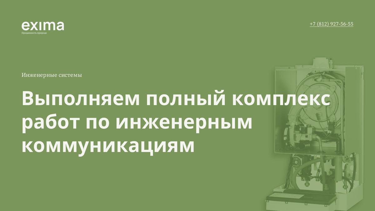 - Оборудование системы газоснабжения. 👉Эксперты строительной компании EXIMA выполнят работу максимально качественно с соблюдением всех требований. Также Вы всегда можете приехать и посмотреть процесс работы Вашего объекта. Обращайтесь к нам и мы поможем! Телефон для связи: +7 (812) 927-56-55