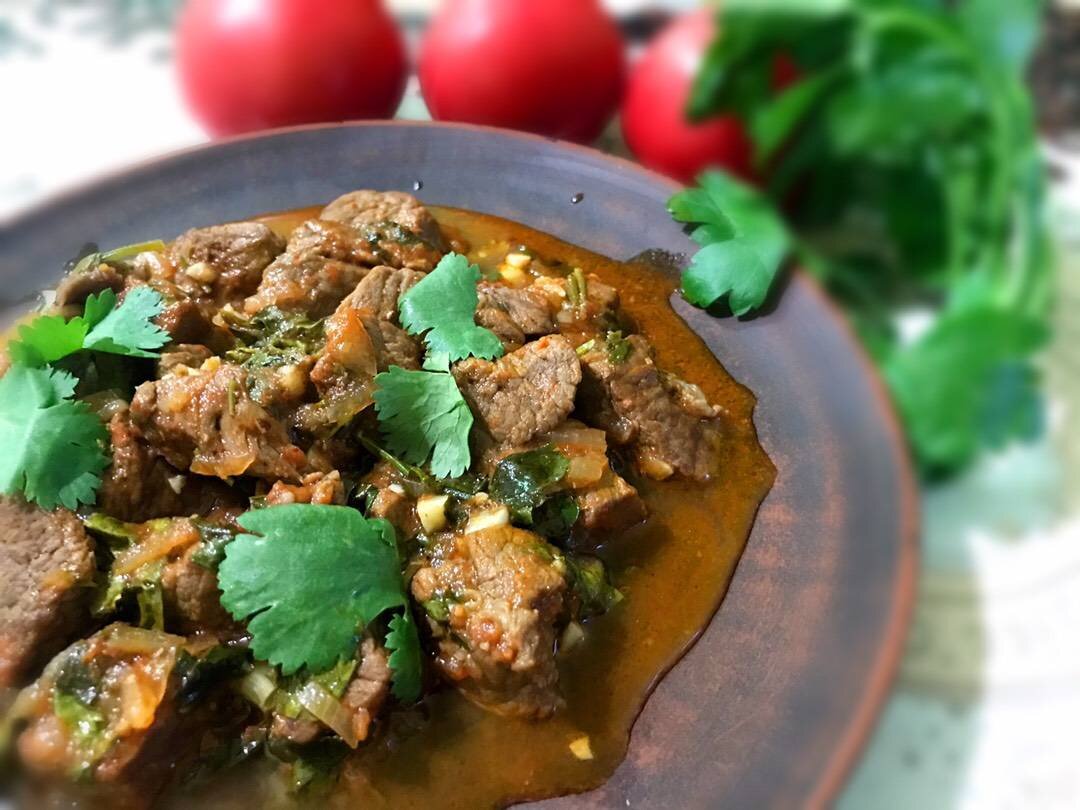 Это блюдо Грузинской кухни- мясо, томленое с томатами и ароматными специями, чесноком и свежей зеленью. Гранатовый сок даст нейтрализацию кислотности помидоров и придает великолепный вкус блюду 🤤 Ингредиенты: мякоти говядины, курдючного жира, репчатого лука, свежих помидоров, сливочного масла, Соль, чёрный молотый перец , Из специй у меня: молотый кориандр, сухая аджика, уцхо сунели, шафран, гранатового сока, чеснока, Свежая кинза и петрушка Способ приготовления: Мякоть говядины нарезать небольшими порционными кусочками. В сотейнике обжариваем нарезанный курдючный жир. Убираем жир, выкладываем говядину. Обжариваем мясо на умеренно сильном огне до легкого выпаривания жидкости. Затем выкладываем нарезанный тонкими полукольцами репчатый лук, добавляем сливочное масло и тушим 5-6 минут. Помидоры разрезаем пополам, натираем на крупной тёрке. Выкладываем мякоть помидоров в сотейник, добавляем специи и тушим 3-4 минуты- не солим! Вливаем гранатовый сок, накрываем крышкой и тушим на медленном