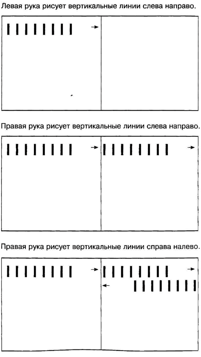 Данное упражнение рассчитана на ежедневное выполнение, при этом каждое задание должно выполняться в течении 3-7 дней в зависимости от возраста и успехов ребёнка. Упражнение направлено на развитие межполушарных связей, расширение поля зрительного восприятия, развитие пространственных представлений, мелкой моторики, способности к произвольному самоконтролю. Прикрепите лист ватмана или кусок обоев на любую вертикальную поверхность (дверь, стену, шкаф) так, чтобы центр листа находился на уровне глаз ребёнка. Ширина листа - размах рук ребёнка. Посередине листа проведите вертикальную линию (сверху вниз), которая разделит его на две половины. Ребёнок стоит напротив середины листа. Перемещаться вдоль листа нельзя. Дайте ребёнку в каждую руку по карандашу или фломастеру и предложите нарисовать вертикальные линии. Каждая линия должна быть размером примерно 10 см.