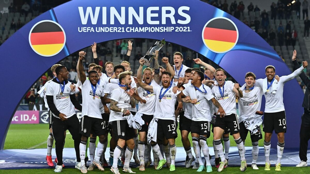 Летом прошлого года в Венгрии и Словении состоялся молодежный чемпионат Европы победу в котором праздновали немцы, которые в финале оказались сильнее португальцев. Мы привыкли к тому, что наши молодежные и юношеские сборные, даже добиваясь успеха, совсем не поставляют игроков для главной сборной, а многие из футболистов там игравших и вовсе никак себя не проявляют на взрослом уровне. И сегодня мы хотим сравнить - а как там у них?
