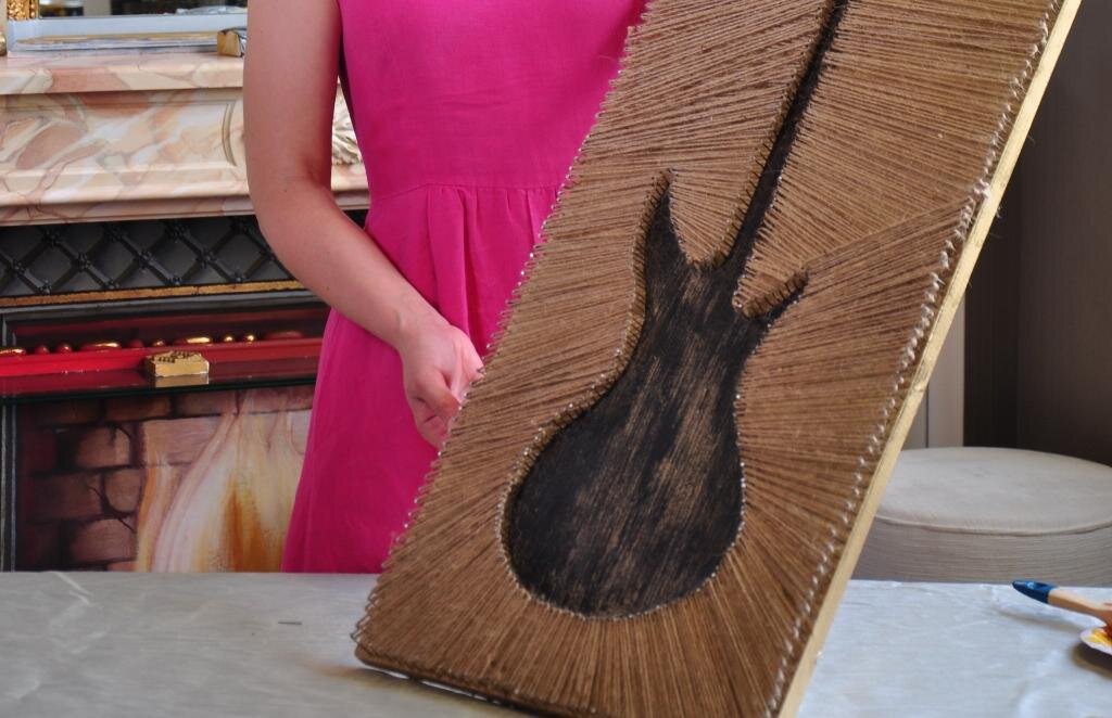 Если вашему дому не хватает интересных арт-объектов или вы хотите сделать приятное вашей второй половине, не обязательно тратить большие деньги на приобретение. Дизайнер Анастасия Каспари показала, как из подручных материалов сделать настоящее произведение искусства. Итак, нам понадобятся: Первым делом подготавливаем основу. Для этого дизайнер окрасила деревянную доску в золотой цвет. Затем карандашом наносим любой рисунок, контур которого будем обрабатывать. В нашем случае это гитара. Теперь по контуру рисунка вбиваем гвозди с шагом около 1 см. Окрашиваем внутреннюю часть рисунка в контрастный цвет. Дизайнер выбрала черный. Не обязательно красить его слишком густо. А теперь начинаем работу с веревкой — соединяем с помощью нее вбитые гвоздики. В результате у вас получится такой оригинальный арт-объект, которым вы легко сможете украсить любой интерьер. Благодарим за мастер-класс дизайнера интерьеров Анастасию Каспари.