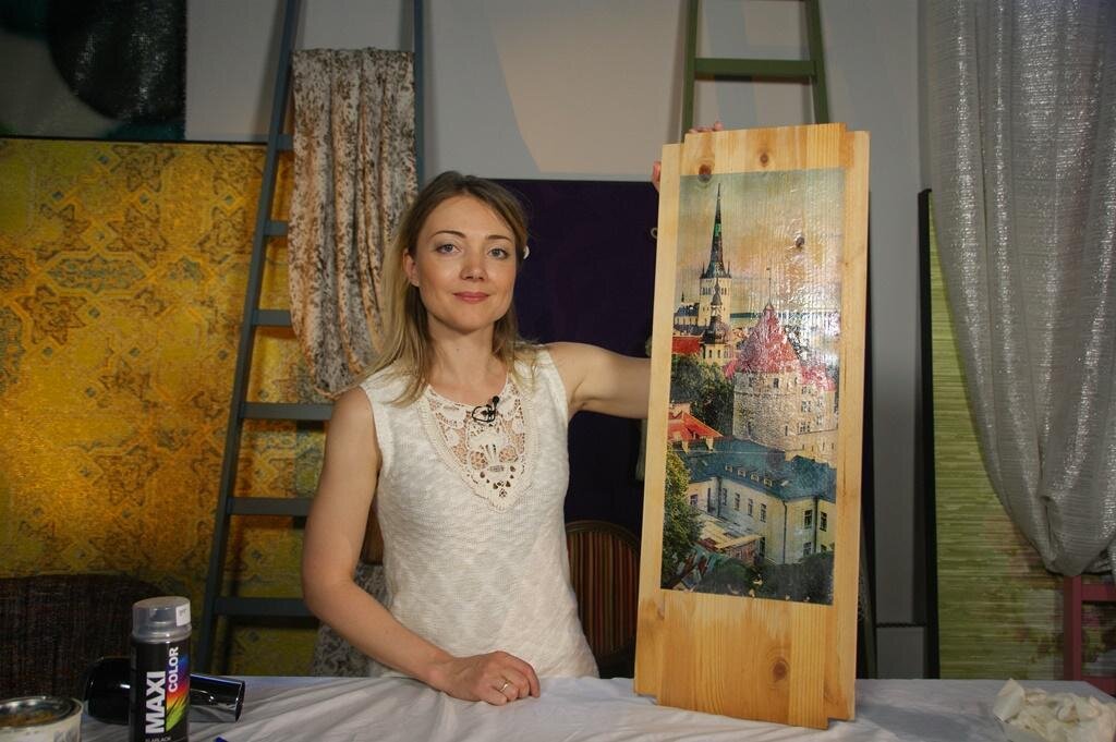 Решили обновить деревянные фасады кухни или сделать оригинальный стол? Тогда вам в помощь мастер-класс от дизайнера интерьеров Анастасии Каспарян, которая покажет, как одна фотография может изменить облик всего интерьера. Вашему вниманию — оригинальный декор деревянной поверхности. Нам понадобятся: Как сделать деревянное панно своими руками Чтобы клей не растекся, делаем рамку на дереве с помощью малярного скотча, предварительно разметив место под изображение. Специальным клеем-трансфером (можно приобрести в любом художественном магазине) густо смазываем изображение с лицевой стороны и деревянную основу, а затем аккуратно наклеиваем изображение по разметке. Обычным валиком прижимаем изображение к основе, удаляя пузырьки воздуха и разглаживая картинку. Ускорить процесс высыхания клея можно обычным феном для волос. Когда клей высох, обильно смачиваем бумагу обычной водой. Дизайнер Анастасия Каспарян рекомендует для этого использовать малярную кисть. Когда рисунок намокнет, аккуратно сним