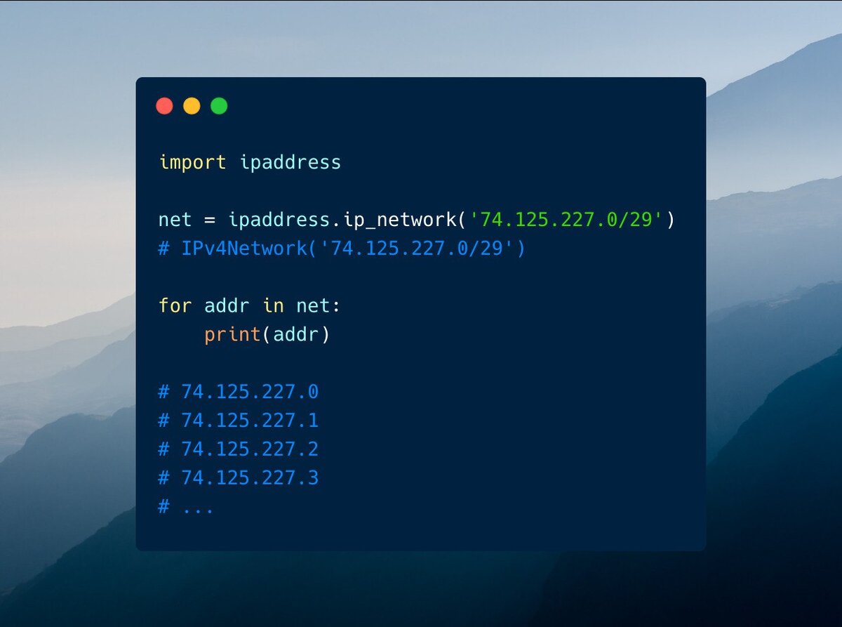 Если вам приходится писать на Python программы для работы с сетью — это значит, что вам может очень пригодиться модуль ipaddress. Одним из вариантов его использования является генерация списка IP-адресов из диапазона адресов, заданных в формате CIDR (Classless Inter-Domain Routing, или бесклассовая адресация). Кстати, у модуля ipaddress есть и много других интересных возможностей, прочитать о которых можно здесь. #ipaddress #python