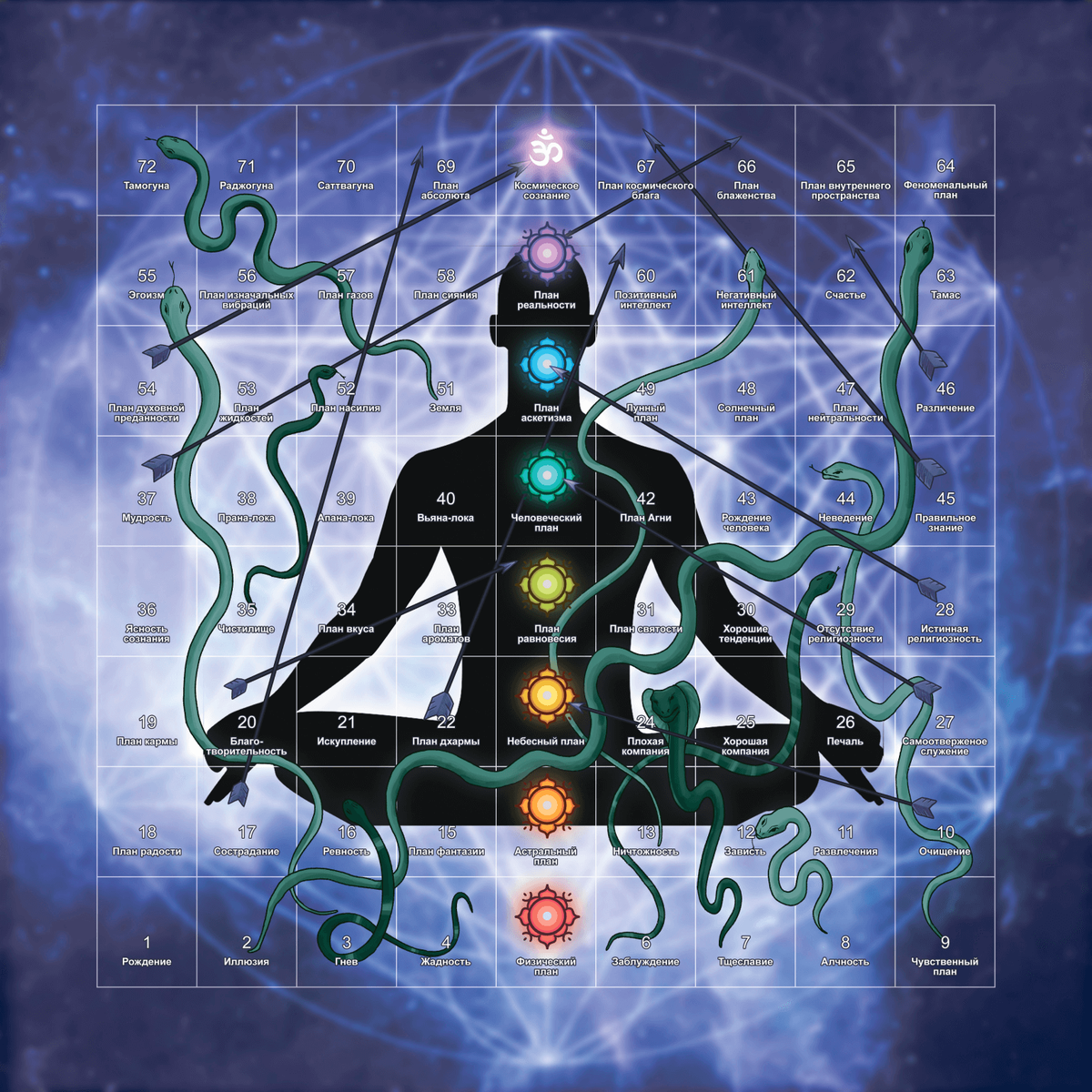 Здравствуйте, сегодня я хочу рассказать об интересной индийской игре Лила, в которую играли монахи еще пару тысяч лет назад. Вероятно вы знакомы с детской игрой Змеи и Лестницы. Так вот эти игры пошли от Лилы. В которой есть те же змеи, а вместо лестниц - стрелы. Игра психологическая, трансформационная. Ее задача - работа с мировоззрением человека, она помогает разобраться в себе и найти ответы на любые вопросы. Как это работает? Клетки игрового поля не просто пронумерованы, они имеют названия и свои значения. Да и сами значения не придуманы просто так. На поле расположены качества человека от условно "плохих" к "хорошим". Вы сами все поймете. Стрелы - это добродетели, получается, что если вы попали на клетку, где начинается стрела, то вы поднимаетесь туда, куда она ведет. Так и в жизни, совершая тот же поступок, в котором начинается стрела, вы попадете туда, куда она ведет. В то же качество, состояние. Поля не только имеют значения. Также они складываются в ряды. Ряды привязаны к ч