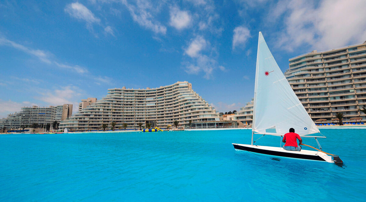 Уже много лет чилийский бассейн на побережье остается самым большим на планете – 1000 метров в длину, более 13 метров в ширину и глубину до 3 метров. Чтобы наполнить такую емкость, нужно более 250 000 000 литров воды. При этом находится бассейн прямо на берегу Тихого океана, а морская вода поступает через сложные фильтры, которые убираю соль, очищают от бактерий и прочих загрязнений.