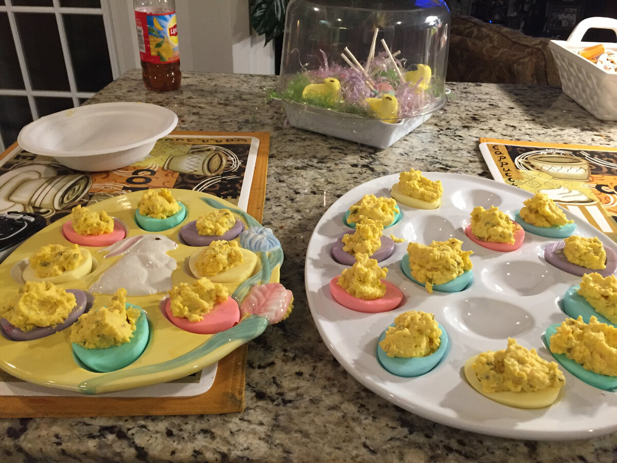- Положите ложкой начинку из яичного желтка в окрашенные половинки.