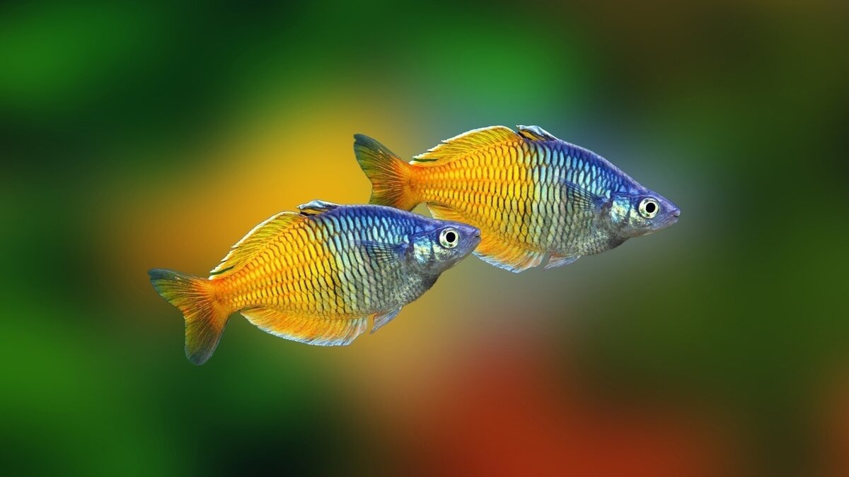 Меланотения Боэсмана или Радужница Боэсмана (Melanotaenia boesemani). Принадлежит семейству Melanotaeniidae.Рыбка обнаружена в 1954 году в ходе голландской экспедиции доктором Маринусом Боэсманом (dr. Marius Boeseman). Затем повторно открыта в 1982 году. Тогда же первые экземпляры нового вида были доставлены в Европу и послужили основой для создания современных гибридных форм, доступных в продаже. АРЕАЛ ОБИТАНИЯ: Происходит с западной оконечности Новой Гвинеи, известной также как Ириа́н-Джа́я или Западный Ириан, на территории современной Индонезии. В природе встречается лишь в трёх небольших озёрах и их притоках. Предпочитает мелководные регионы с густой водной растительностью. В естественной среде обитания находятся под угрозой исчезновения. Большинство представленных в продаже рыб выращены на рыбьих фермах. ОПИСАНИЕ: Окраска переменная, голова и передняя часть тела окрашены в голубой цвет, который переходит в жёлто-оранжевый на задней части и хвосте. Самцы крупнее и