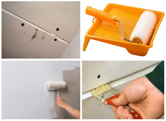 - Вылейте из общей емкости небольшое количество грунтовки в малярный лоток, и кисточкой хорошего качества пройдите все швы и неровности гипсокартона;
