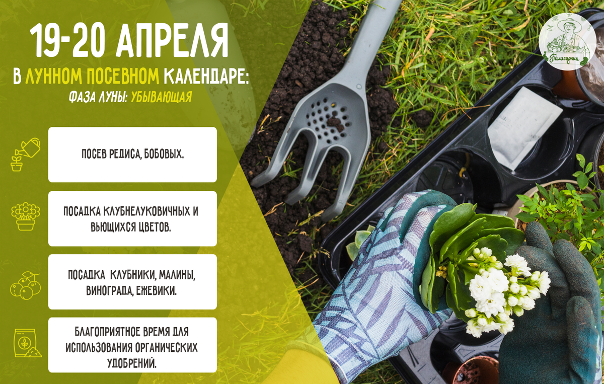 В огороде рекомендуется посев редиса, бобовых. • Благоприятные дни для посадки клубнелуковичных и вьющихся цветов. • Дни подходят для посадки клубники, малины, винограда, ежевики. • Фаза Луны: убывающая – благоприятное время для использования ОРГАНИЧЕСКИХ удобрений. Хорошего урожая!