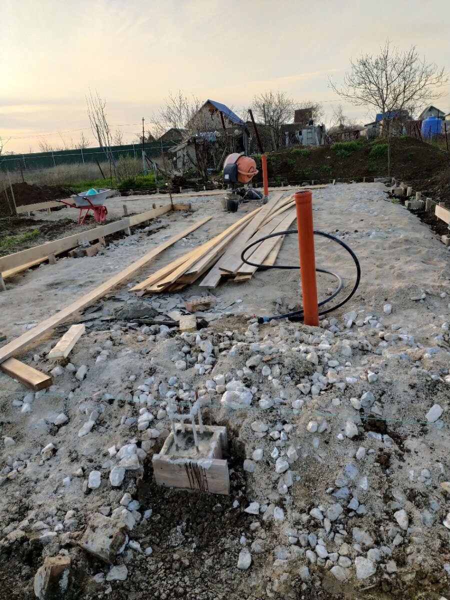 Здравствуйте! Вот и подошло дело к серьезной работе. Засыпка, подбетонка. А перед этим надо было прокопать траншеи под будущую канализацию, провести водопровод. Начал под воду копать трактором, но метровый ковш, перебор, под дюймовую трубу, такая траншея, что я потом вручную сроду не закопаю, а опять вызывать трактор, дело затратное. Решил выкопать сам. Да уж, грызть лопатой Крымский грунт, то еще удовольствие, но справился. Когда открыл колодец, ахнул. Он почти по крышку заполнен водой, но мы ж подготовлены. Дренажный насос с собой. Выкачал, по уши в грязи, но водосчетчик со всеми прибамбасами установлен. Вода на новом участке теперь есть. Пиломатериал для опалубки купил в верхнем магазине. Разговорились с человеком, который привез. Хорошо говорит, начал Парус развиваться, хоть какой то шевележ пошел. Да мы говорю и сами когда участок купили, вокруг тишина была, сейчас уже все в домах и заборах. Многие уже здесь, представляю, сколько народу летом будет. Ладно, говорит, весел