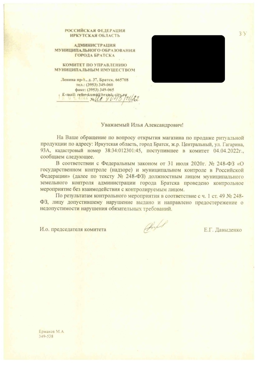 19 апреля пришёл ответ от комитета по управлению муниципальным имуществом, в котором говорится: «В соответствии с Федеральным законом от 31 июля 2020г. 248-ФЗ «О государственном контроле (надзоре) и муниципальном контроле в Российской Федерации» (далее по тексту 248-ФЗ) должностным лицом муниципального земельного контроля администрации города Братска проведено контрольное мероприятие без взаимодействия с контролируемым лицом.