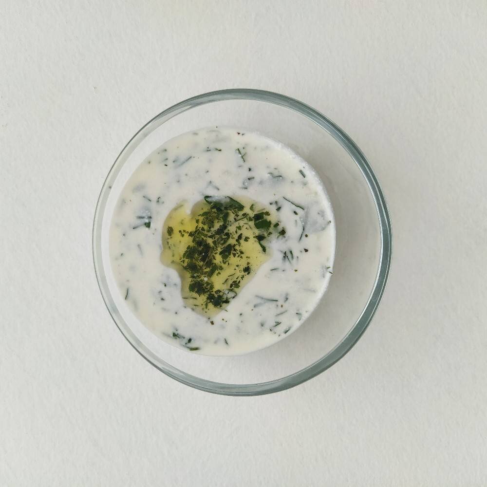 Ингредиенты: йогурт, брынза, зубчик чеснока, лимонный сок/виноградный уксус, оливковое масло, укроп, листья петрушки, мята, соль