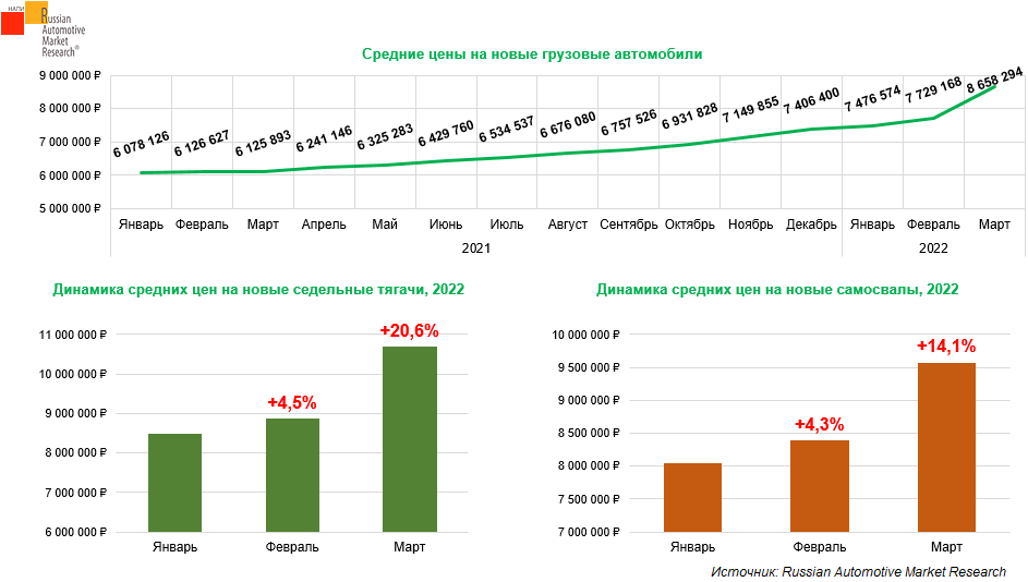 Агентство Russian Automotive Market Research проанализировало динамику средних цен на новые грузовые автомобилии подготовило отчет. Согласно данным RAMR, за год средняя цена на новый грузовой автомобиль выросла на рекордные 41,3%. Так в марте 2022 года средняя цена на новый грузовой автомобиль достигла 8,7 млн. руб. против 6,1 млн. руб. в марте 2021 г. По сравнению с февралем 2022 года средняя цена на новый грузовой автомобиль в марте 2022 г. выросла на 12%. Седельные тягачи за один месяц подорожали на 20,6%, самосвалы – на 14,1%. https://napinfo.ru/infographics/sedelnye-tyagachi-za-odin-mesyats-podorozhali-na-20-6/ Пожалуйста, оцените эту статью и подпишитесь на канал или поделитесь ссылкой на него в социальных сетях, если считаете его интересным.