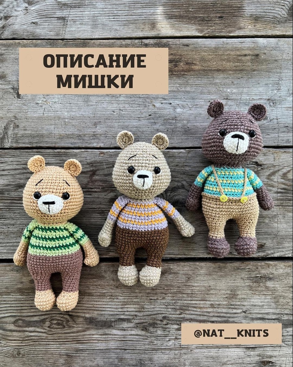 Описание мишки в штанишках 🧸🧸 Автор - Наталия @nat__knits "Голова: основным цветом 1. 6сбн в КА 2. 6пр (12) 3. (сбн, пр)*6 (18) 4. (сбн, пр)*9 (27) 5. (2сбн, пр)*9 (36) 6-7. 36сбн 8. (5сбн, пр)*6 (42) 9. 42сбн 10. (6сбн, пр)*6 (48) 11-12. 48сбн 13. 8сбн, (пр, 2сбн)*3, 15сбн, (2сбн, пр)*3, 7сбн (54) 14. 8сбн, (пр, 3сбн)*3, 15сбн, (3сбн, пр)*3, 7сбн (60) 15-17. 60сбн 18. (8сбн, уб)*6 (54) 19. 54сбн 20. (7сбн, уб)*6 (48) 21. (4сбн, уб)*8 (40) 22. (2сбн, уб)*10 (30) 23. (3сбн, уб)*6 (24) 24. (6сбн, уб)*3 (21) Оставить кончик для пришивания Глазки 9мм, разместить между 13 и 14 рядами, на расстоянии - 8сбн Ушки: основным цветом 1. 8сбн в КА 2. 8пр (16) 3. 16сс Оставить кончик для пришивания Мордочка: белым цветом 1. 6сбн в КА 2. 6пр (12) 3. (3сбн, пр)*3 (15) 4. 15сбн Оставить кончик для пришивания Ручки: основным цветом 1. 6сбн в КА 2. 6пр (12) 3-4. 12сбн 5. 5сбн, 3ссн в 1 петлю, 6сбн (12) 6. 4сбн, 2уб, 4сбн (10) 7-11. 10сбн Сменить на цвет кофточки 12. За ЗСП 10сбн 13