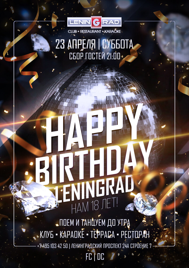 18 нам уже! Приходите на наш праздник 23 апреля! Для Вас как всегда лучшие хиты и лучший звук,самая крутая атмосфера веселья и беззаботности и конечно, неизменно вкусная кухня! Резерв столов: 89057030806 Ленинградский пр-т 24А