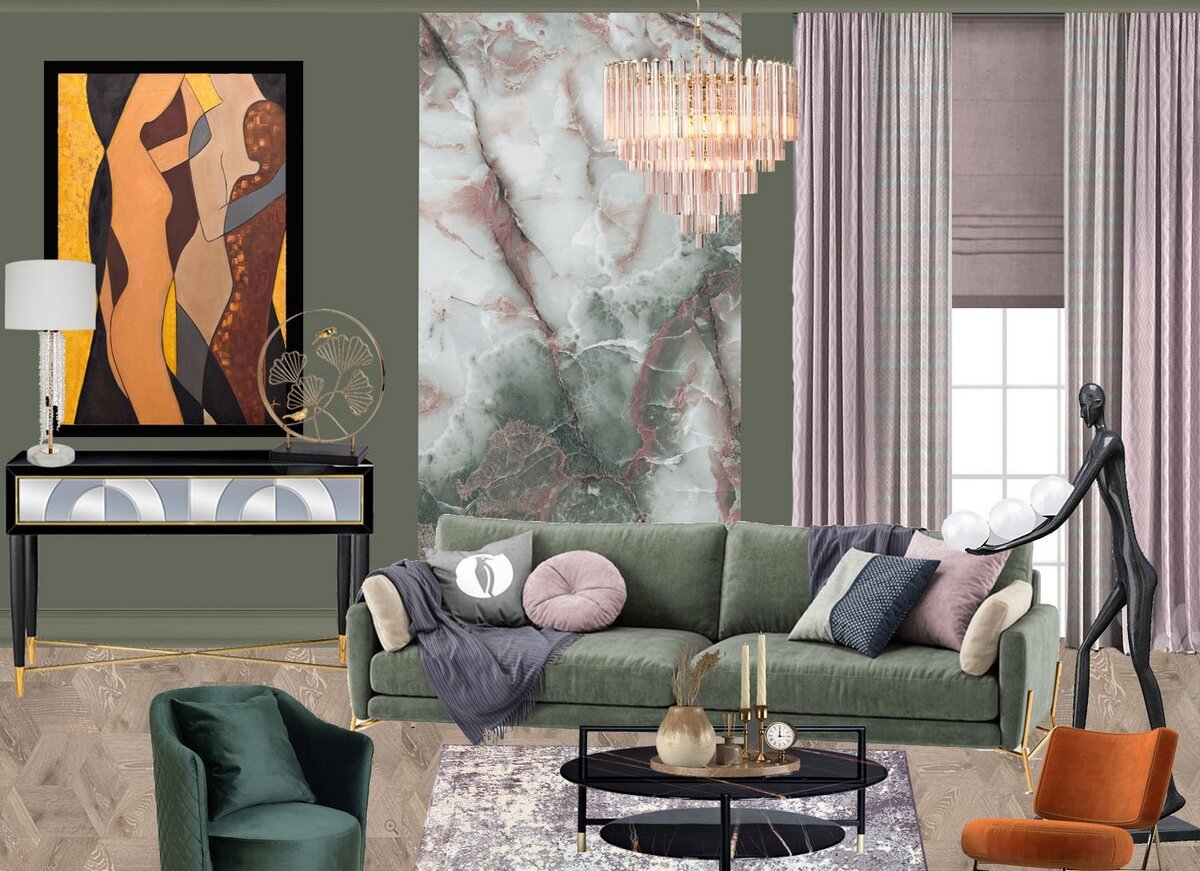 Дизайнер Наталья Носачева сделала творческий коллаж для мини гостиной в частном доме с панорамными окнами и выходом в хвойный лес. Центральным элементов стала мраморная панель, которая объединила в себе все основные оттенки интерьера. Стены и диван цвета припыленных хвойных веток привлекают свой бархатистостью, обволакивают и расслабляют. Акцентными элементами стали картина и кресло цвета охры, они разбавили довольно спокойный интерьер. Пудровые оттенки текстиля добавляют романтичности. Диван LE MARAIS от Сalligaris в оливковом цвете, вдохновленный лесом. Мы нашли для вас эту же модель, в пудрово-розовом цвете. Тонкое и элегантное основание из металла динамично поддерживает удобные подушки дивана, их мягкое и эластичное наполнение гарантируют высокий уровень комфорта и обеспечивает долговечность. Небольшие подлокотники дополняются комфортными подушками. LE MARAIS универсален, удобен в использовании и предлагает широкий выбор композиций благодаря большому количеству доступных модул
