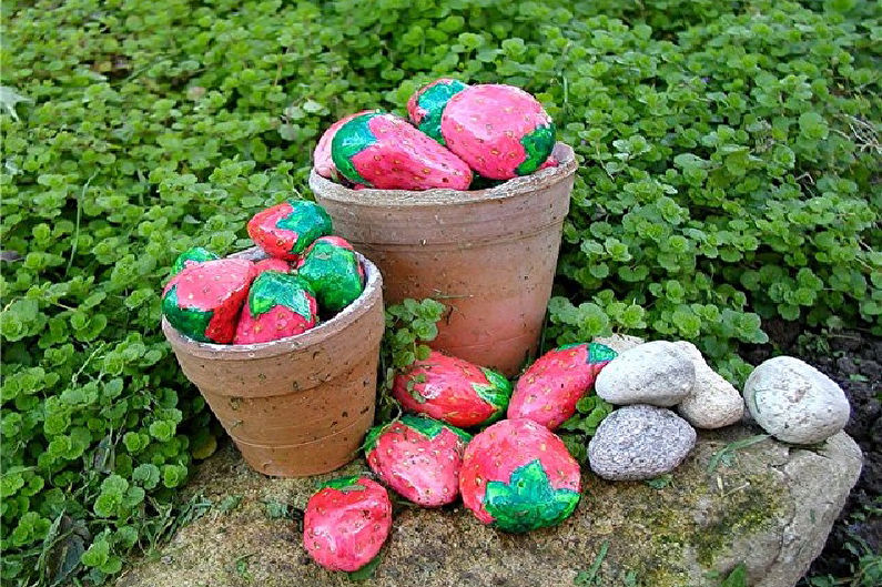 Всем доброго времени суток! Декор для сада и участка можно придумать разнообразный и из подручных материалов отличные изделия получатся, которые будут радовать глаз и поднимать настроение. Предлагаю вот такой интересный декор из камней разрисованных краской. В данном случае главное фантазия, и обычный камень станет замечательным арт - объектом, который добавит настроения и изюминку саду или участку. Камни могут быть различные, разного размера, разного цвета, разнообразной формы, конечно же крупная галька смотрится эффектней, но если пофантазировать, то подойдут любые. На камнях красивых, но неровных, можно просто нарисовать букашек или цветочки на поверхности, а может покрасить целиком и положить в клумбу или под дерево. Итак, смотрите, вдохновляйтесь и творите, украшайте свой сад и участок. Удачи! Очень популярные и очень красиво смотрятся ягодки, клубника, также можно нарисовать малину или ежевику. Ягодами можн