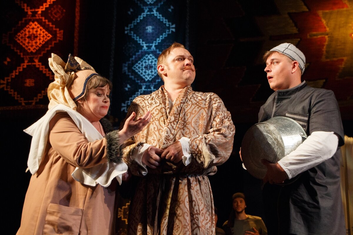 Шлейф этот тянется до сих пор. Поэтому решение Калужского театра рассказать веселую историю про находчивую сваху должно было быть достаточно смелым. Обычно такие пьесы режиссеры берут, только если у них возникает четкая идея того, как развернуть материал с необычной стороны, освежить его современными смыслами. Последняя премьера Калужского драмтеатра разрушила этот «обычай». Публике рассказали историю в ее почти первозданном виде, при этом режиссер сумела аккуратно вплести грузинский колорит в русскую постановку.