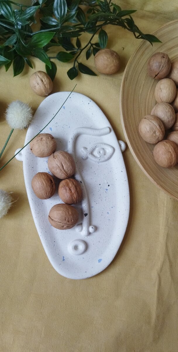 У него есть скрытый функционал: для ароматерапии. Для ароматических палочек предусмотрено отверстие и достаточная высота чтобы при падении пепел успел остыть и не повредить поверхность изделия). К данному подносу предусмотрена отдельным артикулом ладонь, она как бы игриво закрывает второй глаз. На примере можно увидеть применение ладони, для пало санто или как дополнительная функция к подносу более крупные украшения внизу, а мелкие серьги сверху для исключения момента потери или спутывания аксессуаров между собой!