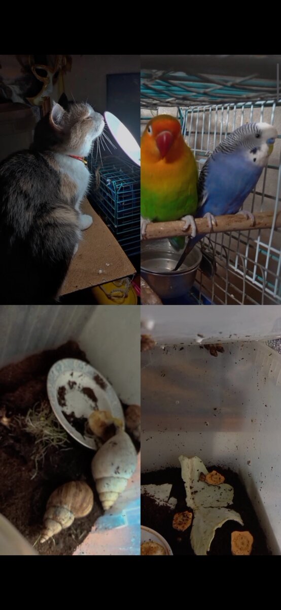 Мои животные Попугаи2,улитки(три больших и много маленьких) и кошка Я тут буду показывать моменты из жизни своих животных #питомцы #животные #улитки #ахатины #попугаи #волнистый попугай #неразлучники