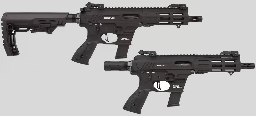 Фирма Derya представила линейку 9-мм PDW Derya ZY9. Турецкая компания Derya Arms представила линейку полуавтоматического оружия ZY9 под патрон 9×19r. Модель предназначена для самообороны и служебного использования. Материал опубликован в журнале «КАЛАШНИКОВ» С юридической точки зрения, все варианты линейки Derya ZY9 в большинстве стран Европы считаются пистолетами, где термины «пистолет» или «винтовка» определяются не наличием приклада, а соотношением длины ствола и общей длины оружия. В США только одна из моделей (Derya ZY9 B6) относится к пистолетам, в то время как все остальные будут классифицироваться как SBR (короткоствольные винтовки) и, таким образом, подпадать под действие иных правил оборота оружия. Все модели серии Derya ZY9 построены на ствольной и спусковой коробках из алюминиевого сплава с анодированием чёрного цвета и доступны со стволом длиной 150 или 250 мм с резьбой на дульном срезе для установки пламегасителей, ДТК или глушителей. Автоматика работает за счёт энергии о