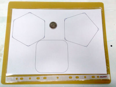 Круглые подставки под пивные кружки просты в изготовлении благодаря тому, что опалубка для них сворачивается из бумажной полосы, которая сама принимает нужную форму, будучи замкнутой в кольцо. В случае потребности в подставках иной формы лучше подготовиться более основательно – сделать опалубку силиконовой, благодаря чему она будет ещё и многоразовой. Изготовление её состоит из двух основных стадий: создания гипсовых шаблонов и заливки их формовочным силиконом. В своих заметках я стараюсь не забывать упоминать о трудностях, вызванных зачастую собственными ошибками и поэтому дальнейшее повествование об этапе изготовления шаблонов – яркий пример того, как делать не надо. 1. Сначала я распечатал эскизы шаблонов – в виде квадрата, пяти- и шестиугольника. Размеры их были подобраны так, чтобы в них вписывался круг диаметром 10 см. У последних двух фигур скругление углов я наметил карандашом при помощи пятирублёвой монеты. 2. Эскизы вырезали и вокруг них, соответственно габаритам,