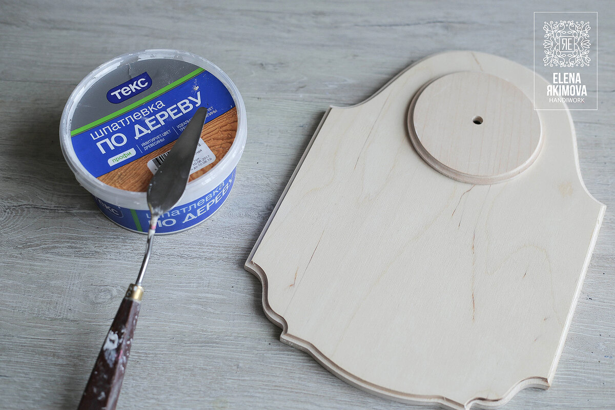 Необходимые материалы 1. Заготовка часов 2. Шпатлевка по дереву 3. Мастихин 4. Трафареты 5. Наждачная бумага № 320 6. Кисти плоские синтетика 7. Краска акриловая голубая, индиго и бежевая 8. Наждачная бумага №100 9. Салфетки бумажные 10. Распечатка циферблата на ч/б лазерном принтере (обычная офисная бумага) обязательно в зеркальном отражении: скачать (https://disk.yandex.ru/i/yoRNodjBrv19TA) 11. Жидкость для снятия лака 12. Ложка столовая 13. Ватный диск или салфетка 14. Лак акриловый матовый 15. Часовой механизм 16. Перчатки Сначала нам необходимо создать фоновый объем, для этого мастихином наносим шпатлевку на основу часов, короткими мазками формируя фактуру. Оставляем до полного высыхания. Далее формируем дополнительные объемы с помощью трафаретов. Я сначала наношу орнамент через трафарет, а затем, после полного высыхания, с помощью другого трафарета добавляю обрывки надписей. И снова жду высыхания шпатлевки. Наждачной бумагой №320 я немного сглаживаю поверхность. При этом я стараю