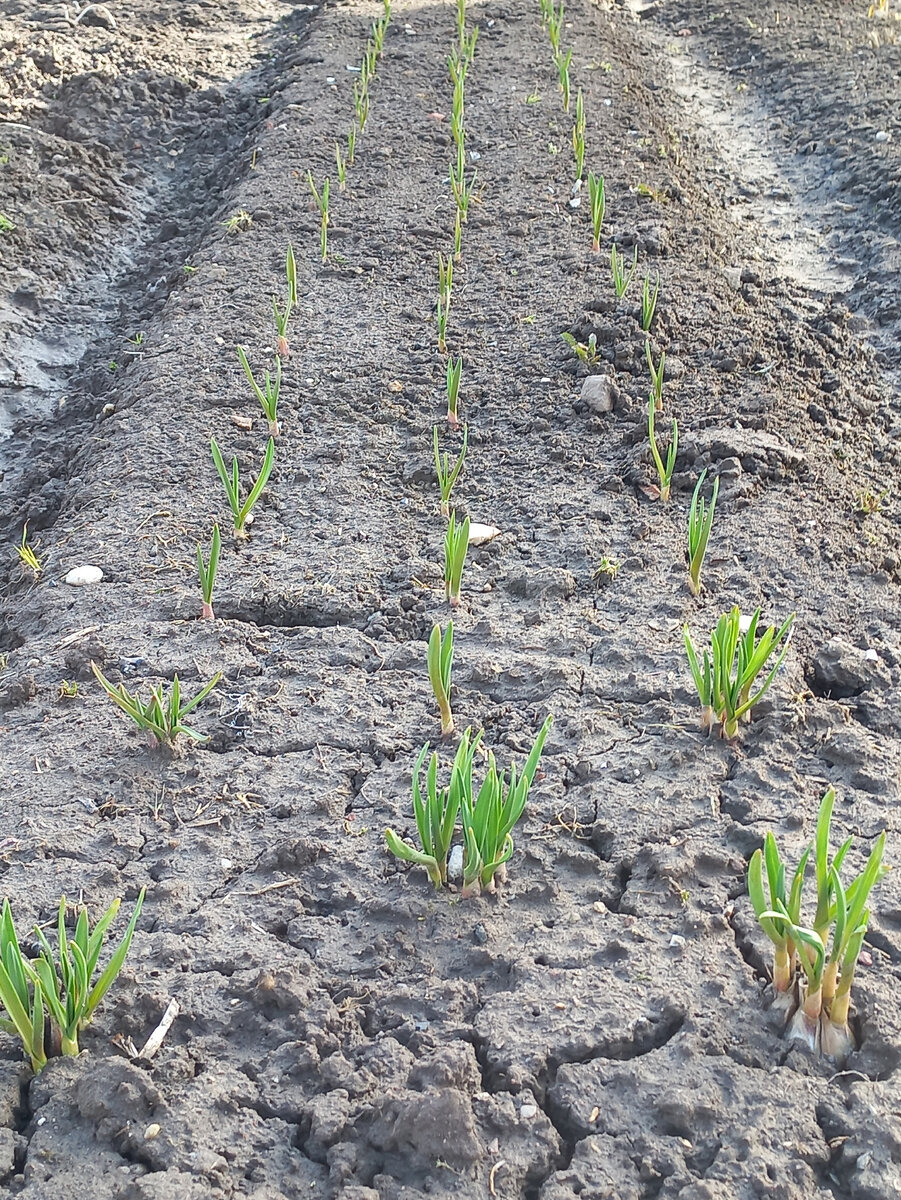 Вот что мне не удаётся до сих пор сделать, так прорыхлить и подкормить озимый чеснок. К гряде не подобраться - в межах до сих пор очень сыро. Хорошо, что гряда была сделана высокой и посадки не отмокли. Успокаивает только то, что всходы выглядят хорошо, нет никаких признаков недостатка питательных веществ. Похоже, что излишнее, на мой взгляд, увлажнение наоборот нравится чесноку. Поэтому с чистой совестью пропускаю подкормку аммиачной селитрой и надеюсь, что когда подсохнет, всё получится с карбамидом (мочевиной). И всё же надо как-то постараться и хотя бы окучить семейный чеснок, о котором я рассказала полгода назад в этой статье: Вроде бы и сажала его по всем правилам, но вот некоторые головки оказались снаружи. Похоже, кроты и мыши помогли, гряда во многих местах в отметинах от их буйной зимней деятельности. Зато видно, как уже развиваются отдельные чесночины в общей семейке: Завтра возможно станет немного суше и тогда попробую дотянуться рыхлилкой до этих выскочек. Всё серьёзно, н