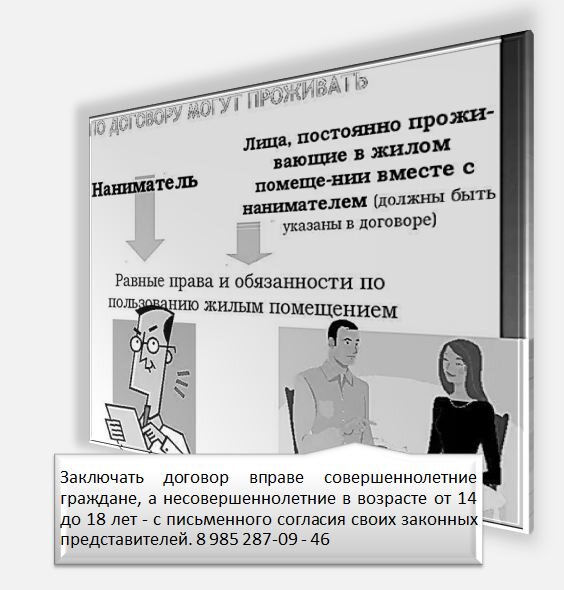 П. 1 ст. 677 ГК РФ (нанимателем по договору найма жилого помещения может быть только гражданин) адресована нанимателю и множеству лиц, совместно с ним проживающих по договору коммерческого найма жилья. Заключать договор вправе совершеннолетние граждане, а несовершеннолетние в возрасте от 14 до 18 лет – с письменного согласия своих законных представителей. Возможны замены нанимателя по основаниям и на условиях, установленных действующим законодательством, и наделение постоянно проживающих положением сонанимателей. Статья 677 ГК устанавливает единственного титулодержателя нанятого помещения из множества его постоянных пользователей – нанимателя. В отличие от ранее действующего жилищного законодательства настоящее содержит указание на обязательное включение в текст письменной формы договора всех совместно проживающих с нанимателем лиц, в т.ч. несовершеннолетних, малолетних, лиц, находящихся под опекой и попечительством. Из закона вытекает, что текущие изменения в составе постоянных пользо