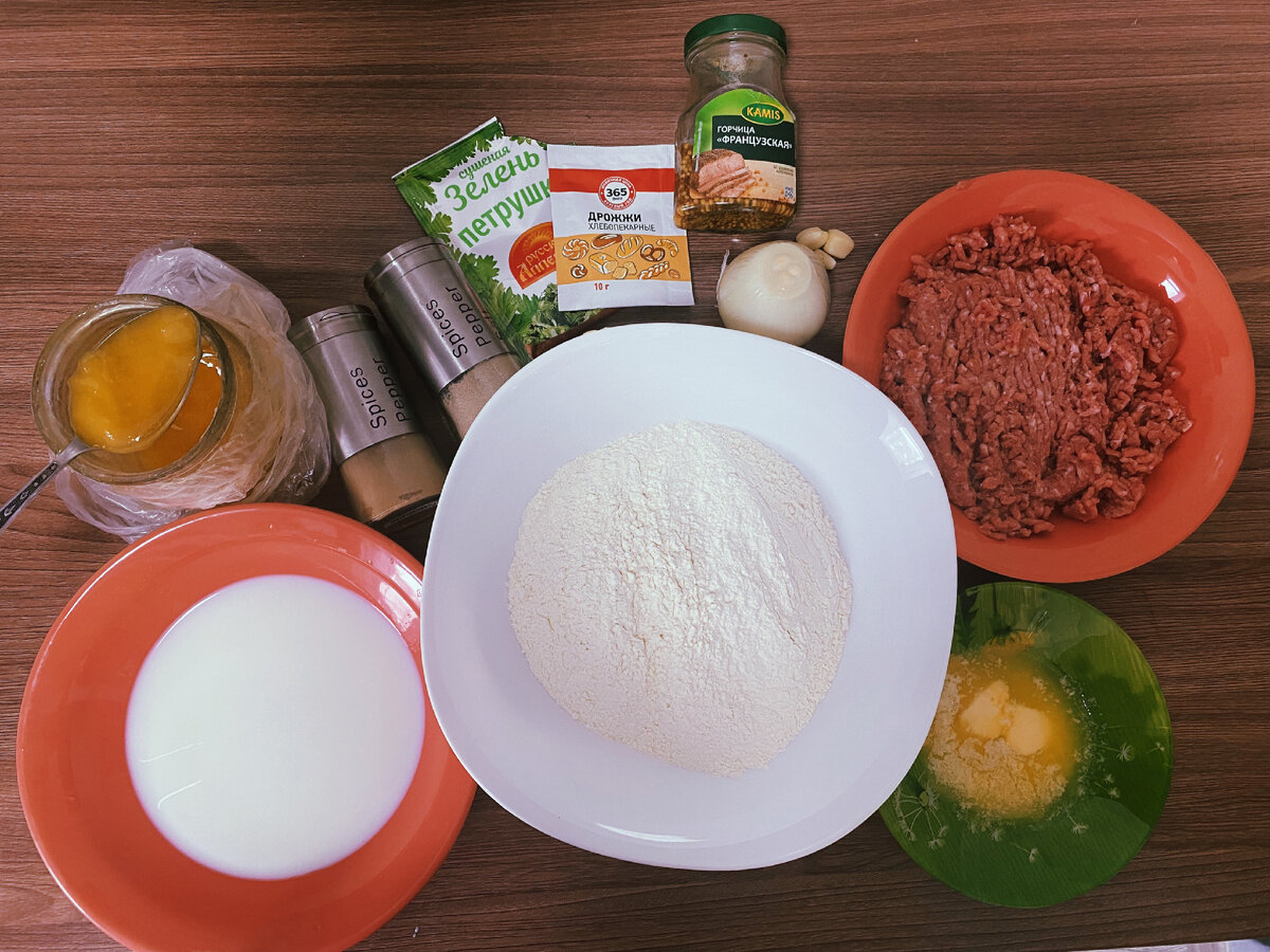 Всем привет ! Сегодня готовим пирожки , они получаются очень вкусные, и что удобно , они быстрые в приготовлении ! Минимум времени и максимум наслаждения 😋 Для приготовления пирожков мне понадобились такие ингредиенты как : Для теста : Для начинки : Теперь давайте разберёмся поэтапно. Этап 1. Тесто. В глубокую тарелку налейте 150 гр. молока комнатной температуры , добавьте 1 ст. л. мёда , перемешайте до растворения мёда и добавьте 1/2 ст.л. сухих дрожжей и все хорошо перемешайте . В глубокую тарелку высыпаем 300 гр. муки и добавляем туда смесь молока, мёда и дрожжей , с добавлением 50 гр. растопленного сливочного масла и замешиваем тесто . Тесто не должно прилипать к рукам . Как замесили тесто , кладём его в целлофановый пакет и откладываем на 30 мин. Этап 2 . Начинка. В глубокую тарелку выкладываем 400 гр фарша ( свинина/говядина) . К фаршу добавляем : 1 луковицу нарезанную кубиком, 3 зубчика чеснока , 1 ст.л. горчицы , солим , перчим и добавляем специи по вкусу (