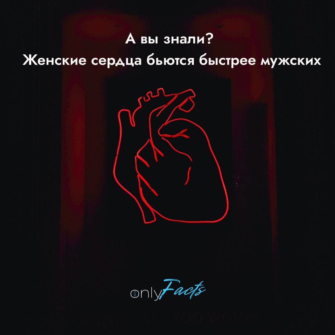 А вы знали, что женские сердца бьются быстрее мужских? Если вы женщина, знайте: ваше сердце бьётся 78–82 раза в минуту против 70–72 раз у мужчин. Это потому, что женские половые гормоны влияют на клетки миокарда, ускоряя их сокращение. Правда, особо гордиться тут нечем, так как из‑за этой особенности женщины чаще страдают от тахикардии и аритмии.