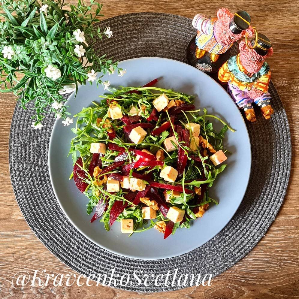 #готовимвместе #академия Яркий и вкусный, этот салат может украсить как праздничный, так и повседневный стол. #пасха #пост За вдохновение спасибо @jcook_A70 Ингредиенты: руккола, свекла, сыр фета (или козий или с плесенью), грецкие орехи, для заправки, оливковое масло, уксус бальзамический, прованские травы, соль, перец Способ приготовления: Подготовить продукты. Свеклу предварительно запечь, остудить. Для заправки смешать оливковое масло, бальзамический уксус, специи. Нарезанную свеклу заправить половиной заправки. Выложить в салатник рукколу, сбрызнуть заправкой. Сверху свеклу, кусочки сыра, полить оставшейся заправкой, затем выложить измельченные орехи. Приятного аппетита!