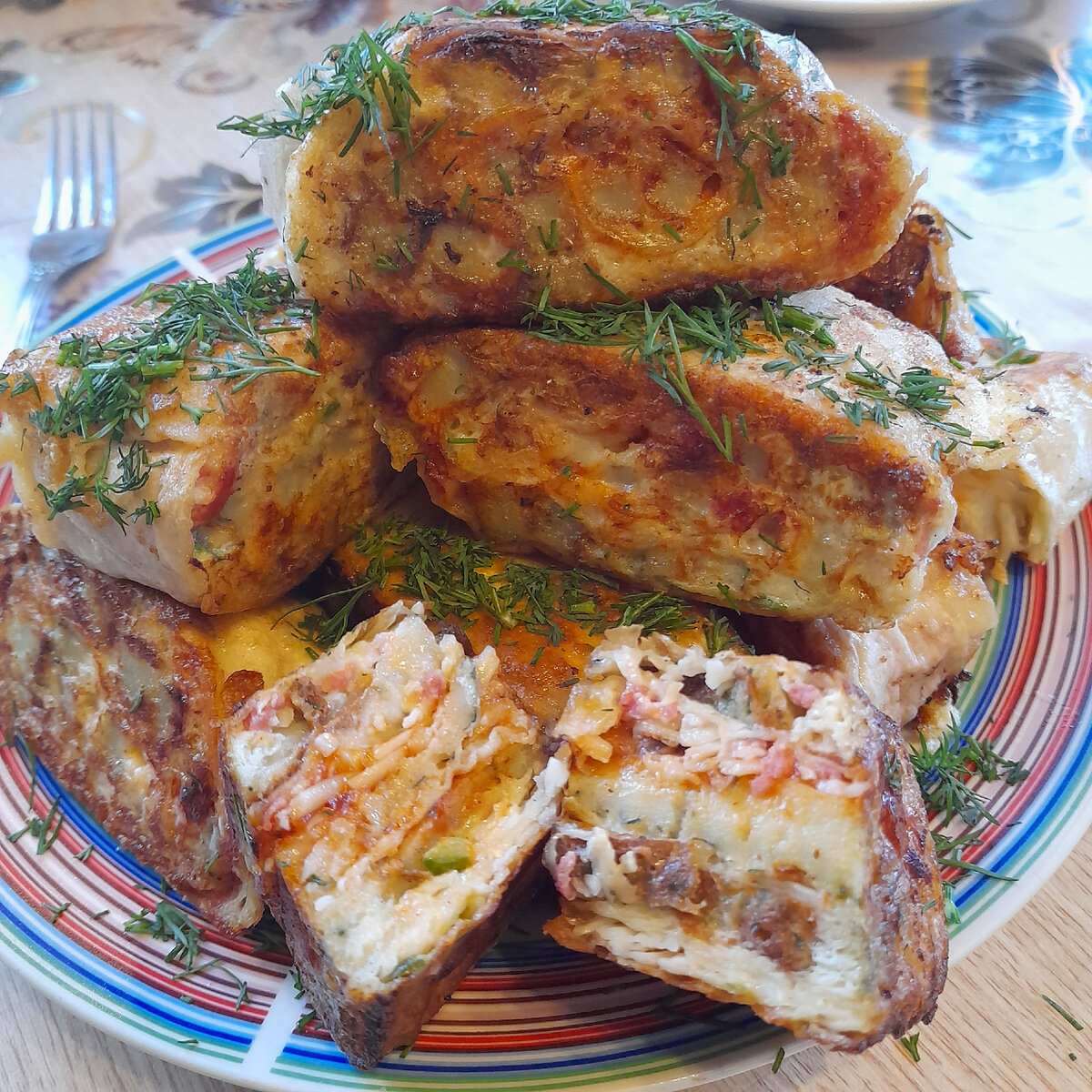 Хрустящие снаружи — сочные внутри. Быстрый и простой рецепт. Отличное блюдо на перекус, особенно на природе. А с учетом начала дачного сезона просто незаменимое. Начинка для рулетиков зависит от содержимого вашего холодильника. Ингредиенты самые простые: Лаваш — 1 шт.; Колбаса «Сервелат» - 300 гр.; Сыр плавленный — 3 шт.; Огурец — 1 шт.; Растительное масло с добавлением сливочного для жарки. Майонез, кетчуп, зелень. Для кляра: Яйца — 2 шт.; Панировочные сухари; Для омлета: Яйцо — 3 шт.; Мука — 3ст.л.; Молоко — 3ст.л.; Соль, сахар, укроп рубленный мелко. Растительное масло для жарки. Подготовка ингредиентов: Замешиваем омлет и отправляем его жариться на малом огне под крышкой. По мере готовности переворачиваем и жарим с другой стороны. Остужаем. На крупной терке натираем колбасу и огурец, сыр на мелкой. Огуречный сок слить. Остывший омлет нарезаем полосочками. Лаваш разрезаем пополам. У нас сегодня два вида рулетиков, хотя не особо отличаются. I вариант: Лаваш смазываем майонезом. Слой