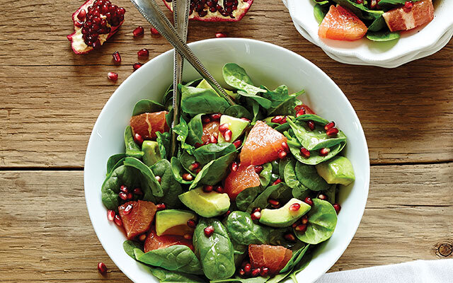 Этот красивый зимний салат сочетает в себе терпкий гранат с острыми цитрусовыми, насыщенным авокадо и темно-темной листовой зеленью. Замените шпинат рукколой, цикорием или зеленью капусты, если хотите. Для дополнительного хруста посыпьте горстью жареных грецких орехов или орехов пекан. Время приготовления: 15 минут Выход: от четырех до шести порций Для салата: -6 чашек шпината, промытого и нарезанного -2 больших красных грейпфрута, очищенных от кожуры, нарезанных ломтиками, затем на четвертинки -2 авокадо, очищенных, без косточек и нарезанных кубиками -1 стакан зерен граната Для заправки: -1/4 стакана грейпфрутового сока -2 ст.л. гранатовый сок -2 ст.л. красный винный уксус -Соль и свеже молотый перец по вкусу -1/2 стакана оливкового масла первого отжима Приготовление. Выложите листья шпината в большую неглубокую миску и украсьте грейпфрутом, авокадо и зернами граната. Взбейте ингредиенты для заправки в небольшой миске до получения однородной массы. Сбрызните сала