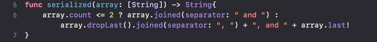 Превратите свой массив в сериализованную строку. Допустим, у нас есть множество авторов. var authors = ["Meng To", "Surya Anand", "Sai Kambampati"] Мы хотим превратить его в сериализованную строку, например: "Taught by Meng To, Surya Anand, and Sai Kambampati" Читайте дальше, чтобы узнать, как это сделать! Создать функцию Во-первых, чтобы протестировать свою функцию, очень полезно использовать игровую площадку Xcode. Узнайте, как использовать игровую площадку, прочитав раздел Xcode Playground в этом руководстве. Затем создайте функцию для преобразования массива в сериализованную строку и протестируйте ее на игровой площадке. После нажатия на Play in the Playground и убедитесь, что все работает должным образом, мы можем использовать эту функцию в нашем проекте. Превратите его в расширение Если вы планируете использовать эту функцию во многих местах проекта, было бы хорошо превратить ее в расширение. Расширение позволяет добавить функциональность к существующему классу, с