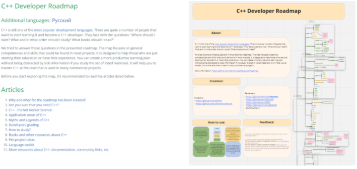 Преисполнившись отсутствием внятной дорожной карты, я принялся за работу. Основной целью карты стала попытка систематизировать актуальную информацию вокруг C++ и экосистемы языка, а также предоставить актуальные источники информации, по которым можно построить свое обучение.