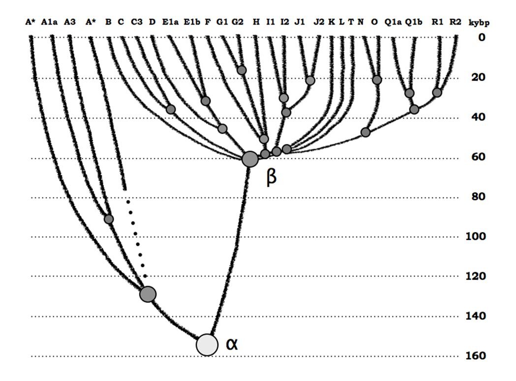 Мы видим, как от альфа-гаплогруппы расходятся африканские линии, в нижней левой части диаграммы, и неафриканские линии, которые стали расходиться примерно 64 тысяч лет назад, после прохождения бутылочного горлышка популяции. Это «бутылочное горлышко» было вызвано, видимо, некой планетарной катастрофой. Древнейшие костные остатки анатомически современного человека, в другой терминологии Homo sapiens, в Европе найдены с датировкой 45 тысяч лет назад (в Англии и Италии). Это данные последних нескольких лет, до этого датировки европейских скелетных находок были 43-40 тысяч лет назад. В этот же малый диапазон попадают и костные находки Homo sapiens в Костенках, недалеко от Воронежа. Датировки стоянки – 50 тыс лет назад, но это сама стоянка, не древних костей. Но когда нет костей, то никто не знает, кто там на самом деле был – может, неандерталец за тысячелетия до появления там Homo sapiens. Поэтому датировки стоянок в «зачет» не идут. Костные остатки в Костенках датируются 38-42 тысяч лет назад, по разным данным.